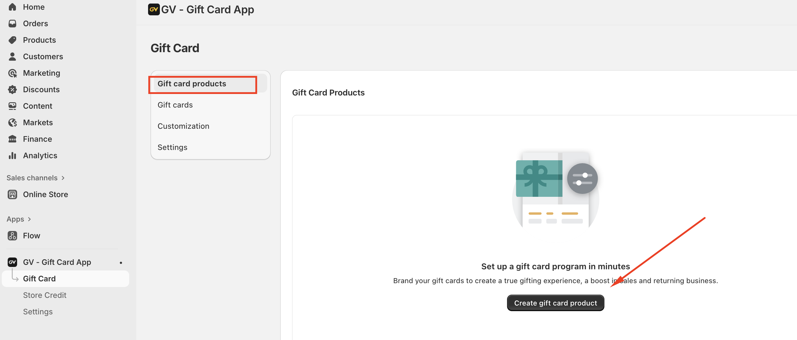 Step 1: In the Govalos app, go to Gift Card Products and click Create Gift Card Product:
