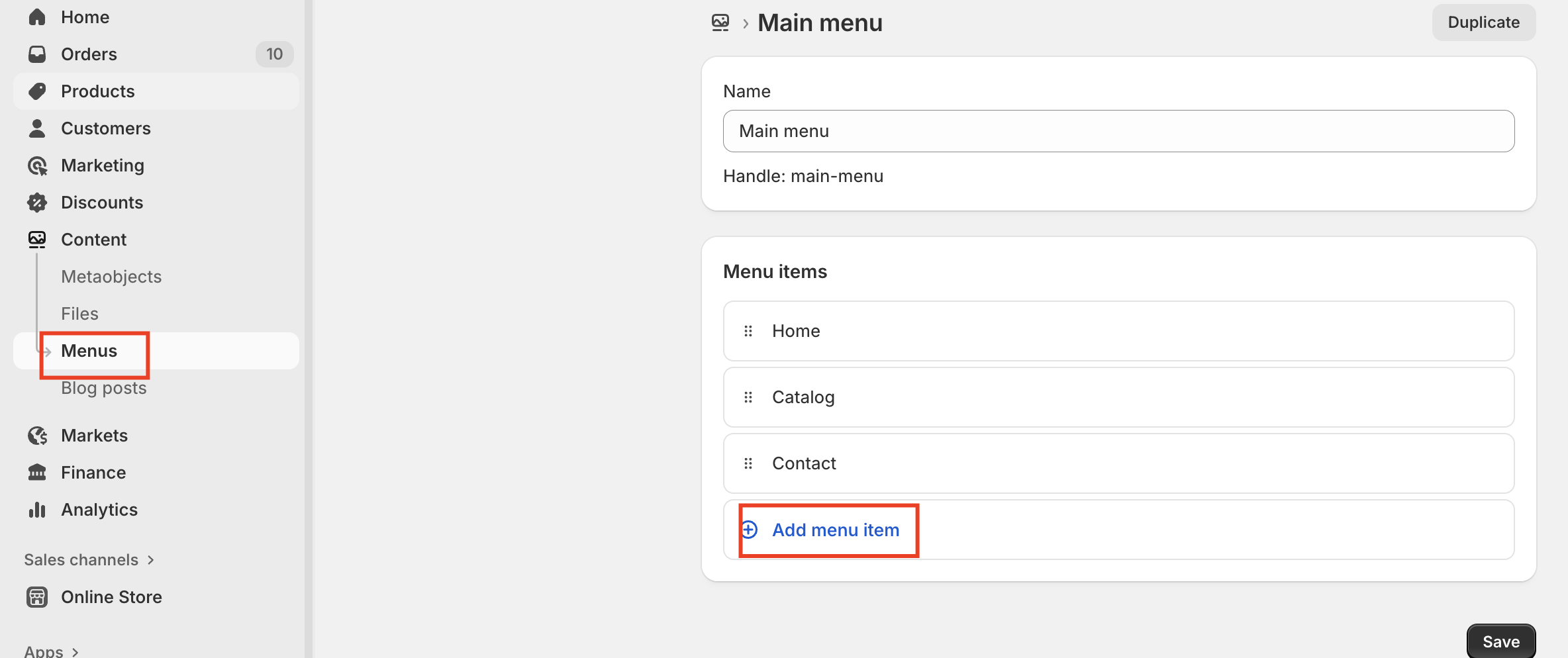 Step 3: Click on either "Main menu" or "Footer menu". Highly recommend putting gift cards on your top page so that visitors can find them easily.