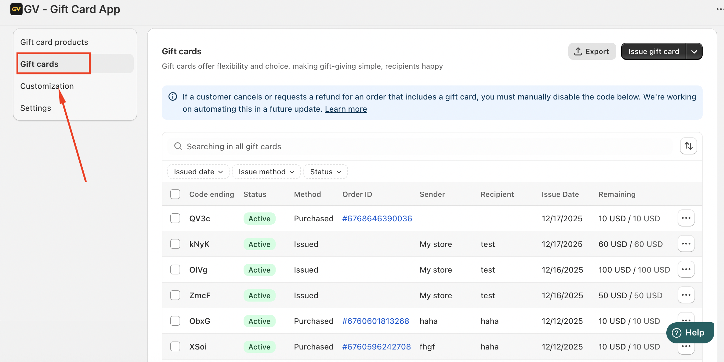 In the gift card dashboard, please click gift card, you can see the list of items issued through GV-gift card including details such as order info (when the gift card has been created through Shopify's checkout), card number, recipient name, recipient email, date issued, remaining balance and the original total value: