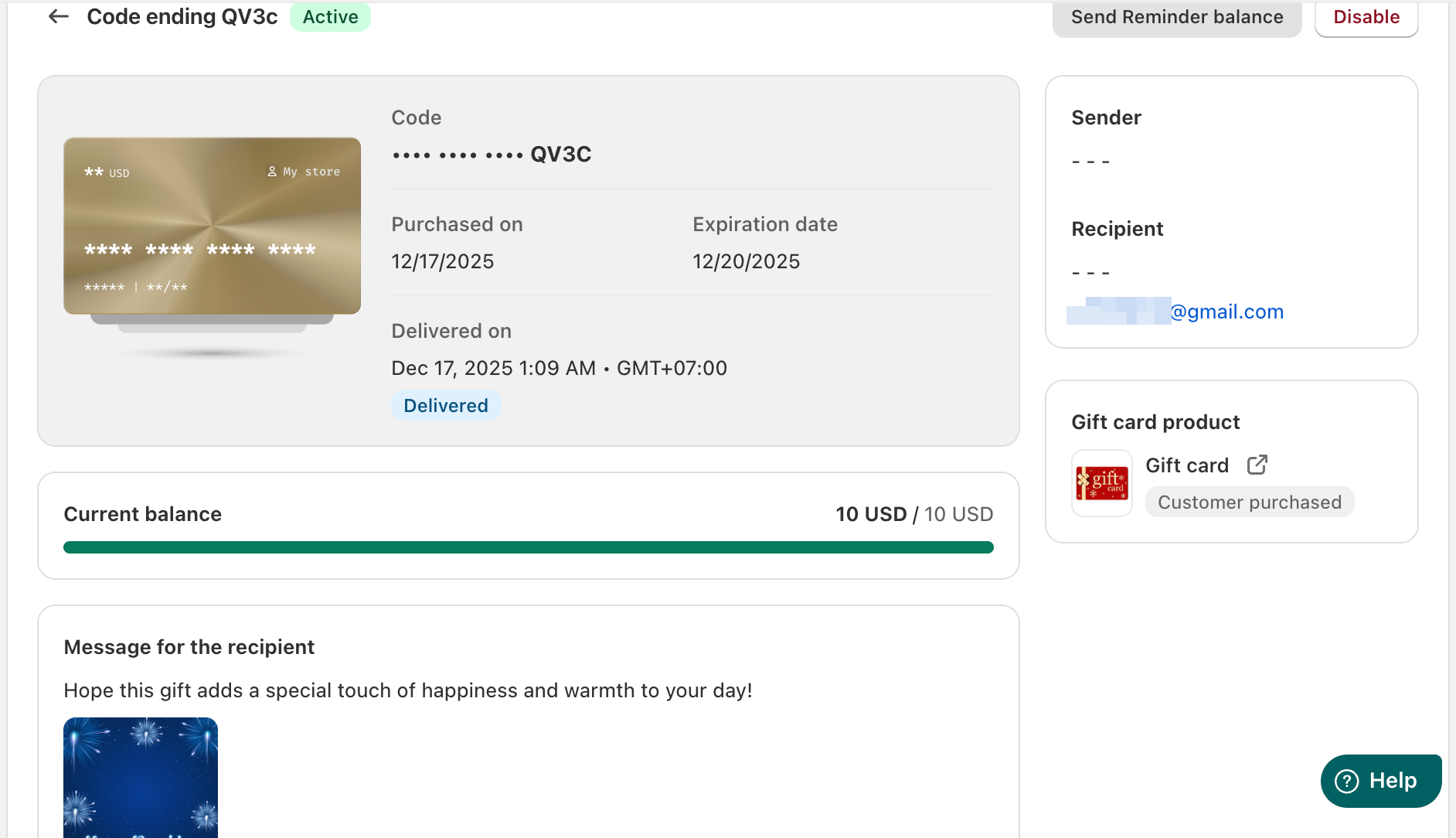 To view more detailed information, click on a gift card code. This will open the gift card details page, where you can see additional data including the sender information, personal note, gift card image, and activity timeline. From this page, you can also perform actions such as editing recipient details or resending the gift card email.