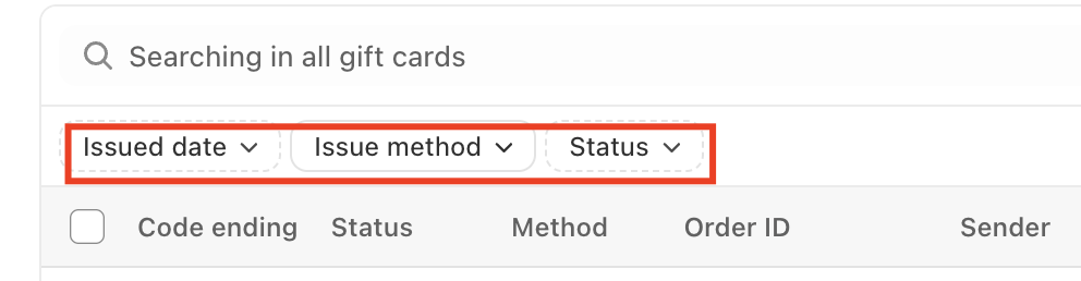 Filter by issuance method, such as gift cards created within the app or purchased directly from your storefront