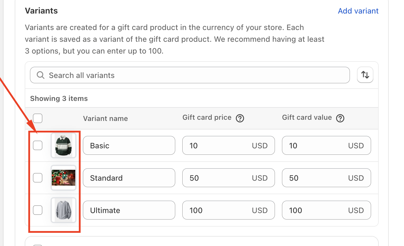 If you are trying to update the image shown for a specific gift card variant, please make sure you update the image directly within the Gift Card product section in app. Changes made there will control how the product image appears on your storefront.
