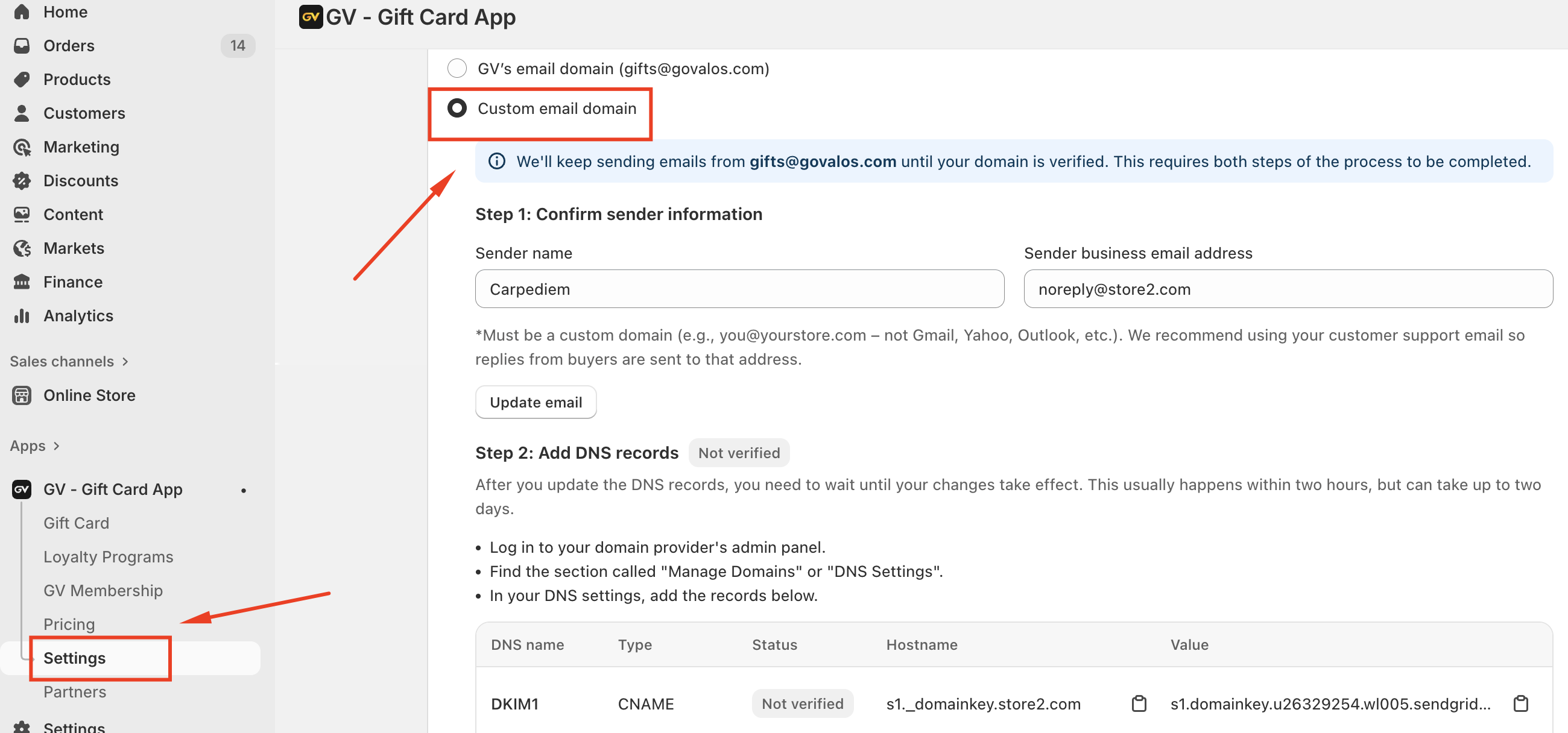 To ensure consistent delivery, we strongly recommend using a custom email domain. Sending gift card emails from your own branded email address improves recognition, engagement, and inbox placement, and significantly reduces the chance of emails being sent to spam.