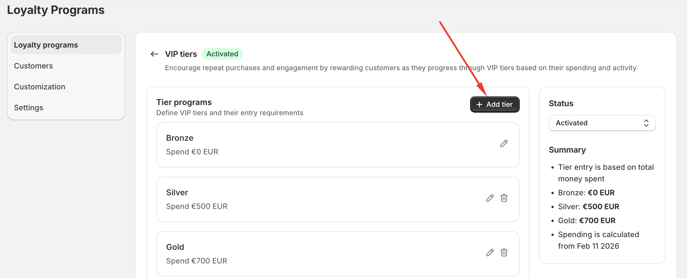 At the top of the VIP tiers page, ensure the status is set to Activated.