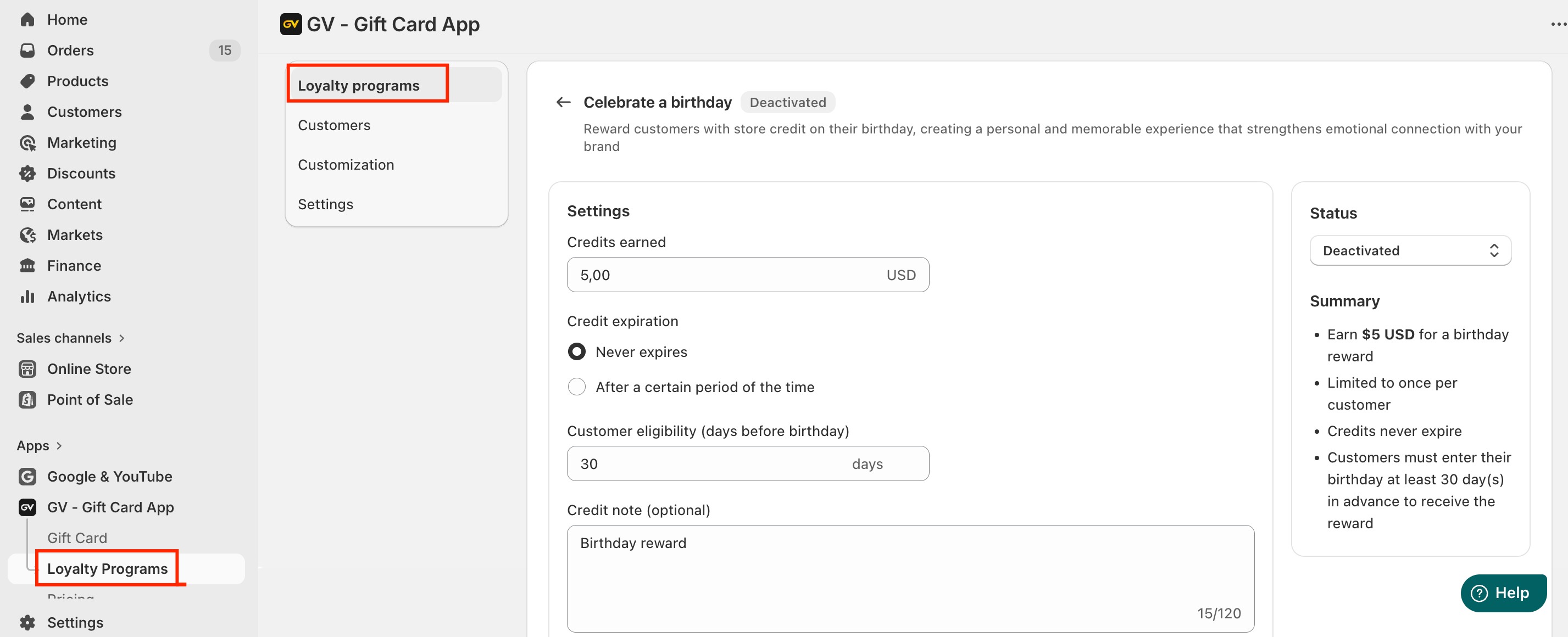 Example: If you enter $5, customers will receive $5 store credit on their birthday.