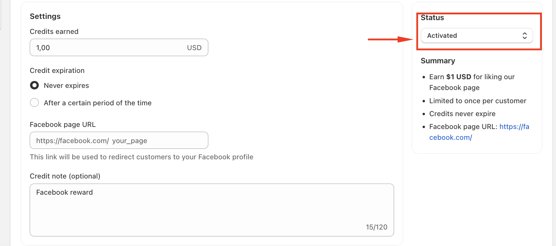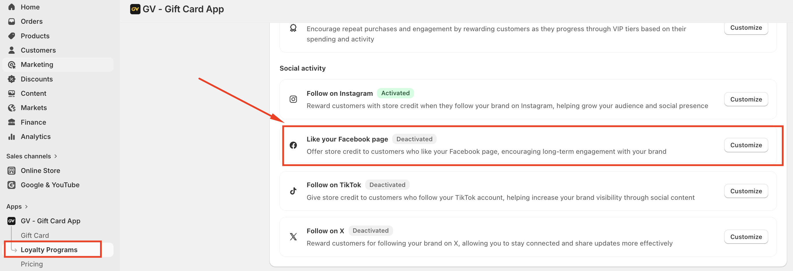 The Like a Facebook Page program allows you to reward customers with store credits when they visit your store’s Facebook page. This helps increase brand visibility and encourage social engagement.