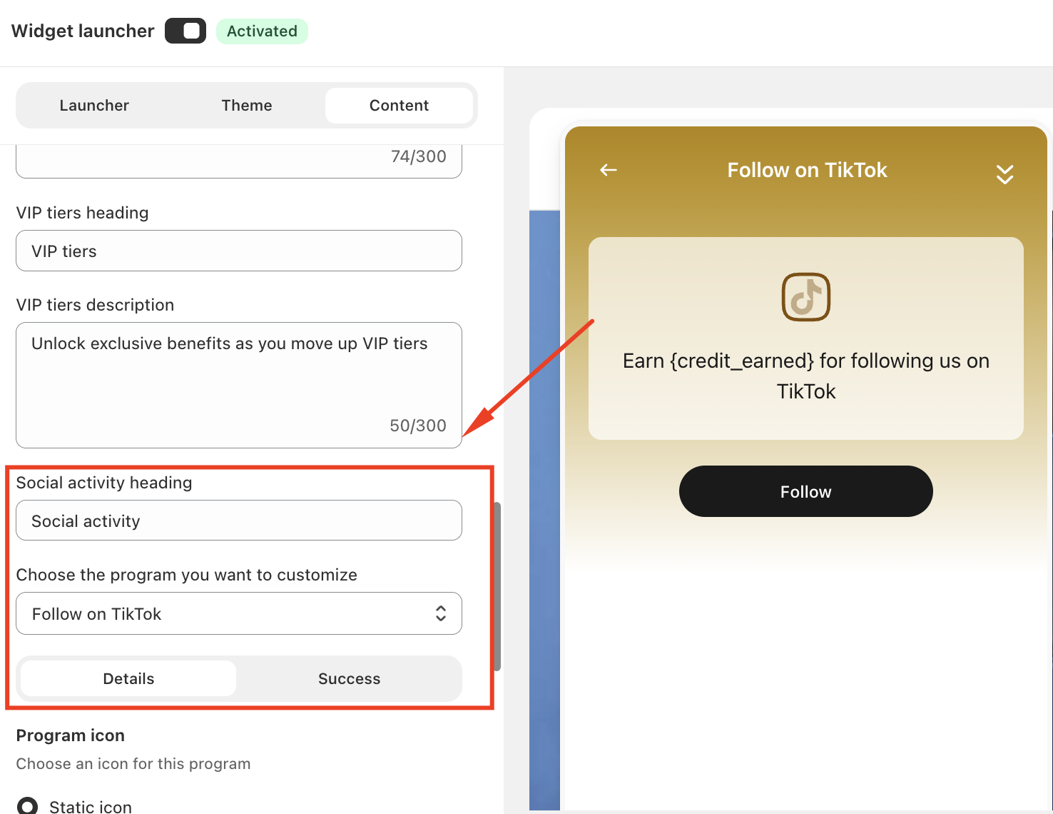 You can customize how the Follow on TikTok program appears in the loyalty widget.