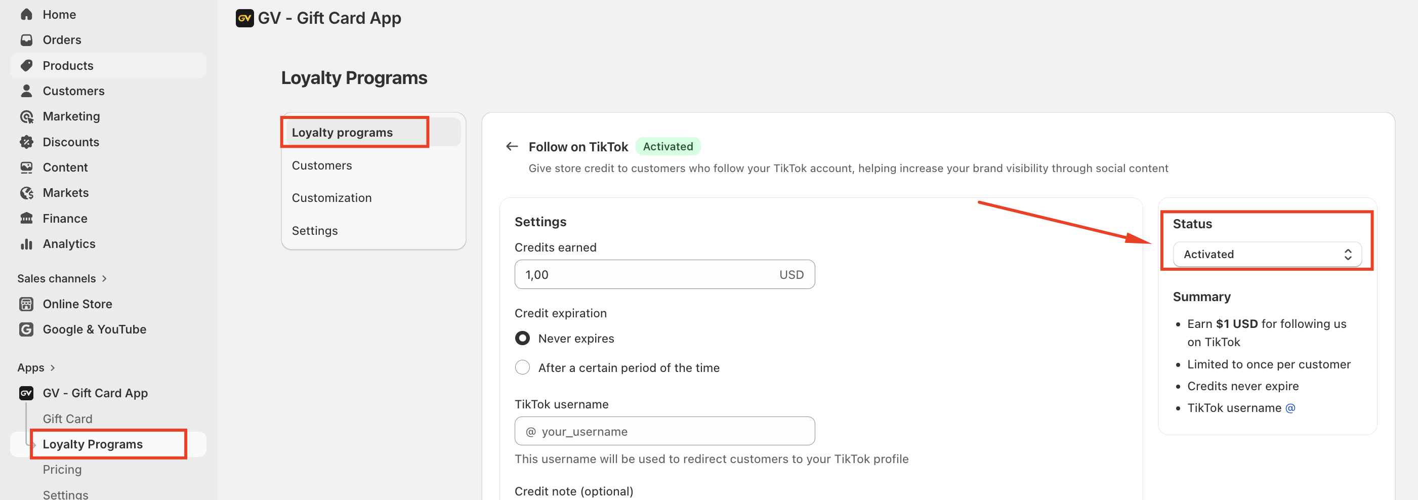 The Follow on TikTok program allows merchants to reward customers with store credit when they visit the store’s TikTok profile. This feature helps increase brand visibility and encourages customers to engage with your brand on social media.